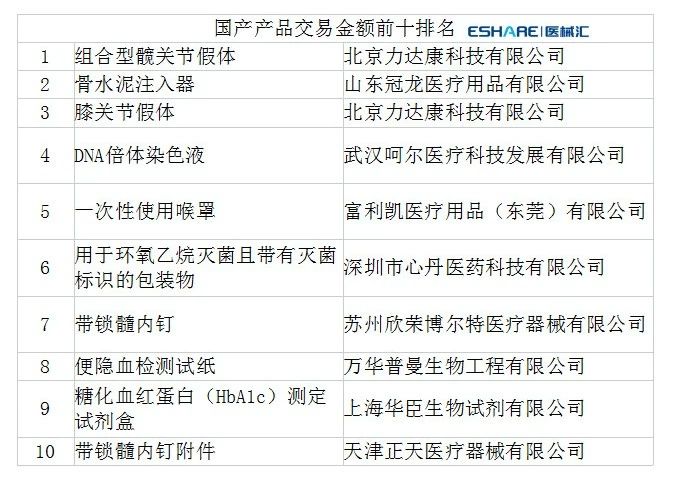美敦力、史赛克、西门子、强生、罗氏、雅培等一众大牌械企依旧榜上有名,但第二位却是来自国产的北京力达康科技有限公司,以主打“骨肿瘤关节”产品异军突起。