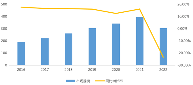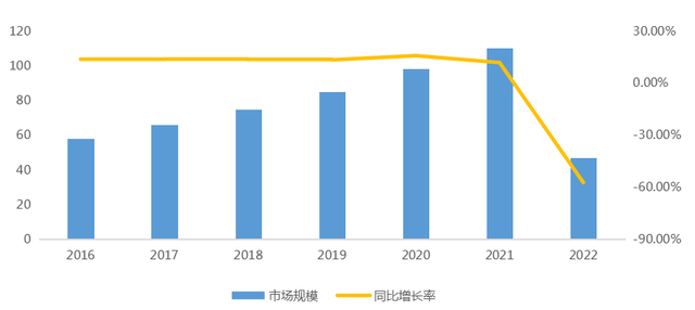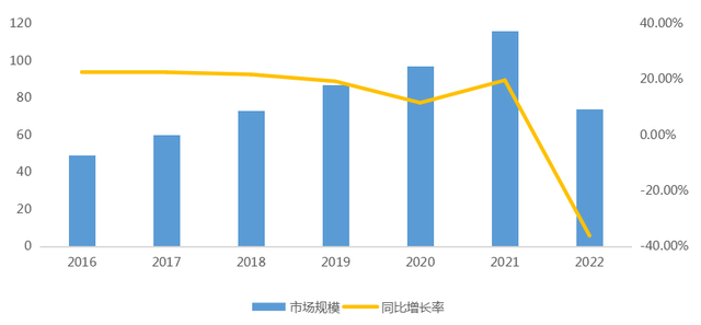 图:2016-2022年中国关节市场规模(单位:亿元)